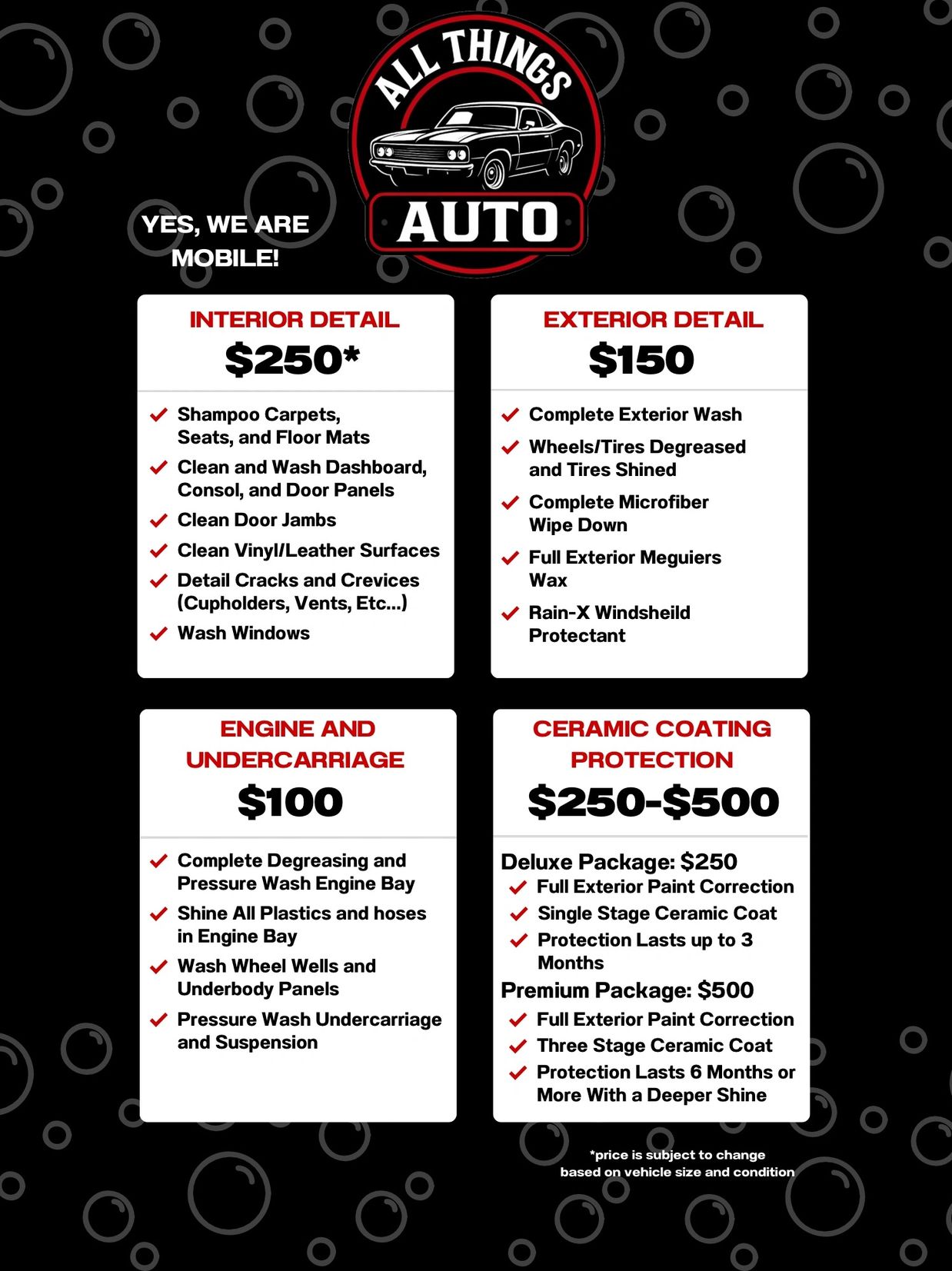 Hello, my name is Benito! I founded All Things Auto in 2025. I am a car enthusiast with a passion for quality work and helping people take pride in their vehicles. My love for cars and spending time with family and friends drives the friendly, customer-first approach behind the business. From detailing to repairs, All Things Auto is your go-to spot you can trust.